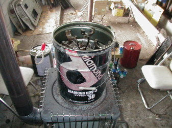 第253話 煮込む・・・・! 2005.1 先回の続きで今回もピストンの煮込み作業です・・・・・ 3〜4時間様子を見つつ煮て見たものの オイルリングしか取れず トップとセカンドのリングは 完全に固まったままです・・・・・・・ こりゃピストンダメかもな〜・・・・・・・ このままやっても進展が見られそうに無いし 中古のL28ピストン&コンロッドを探した方が早そうなので ここで断念・・・・別の作業をする事に・・・・ おっ!そうだっ! 洗浄液も煮立ってる事だし・・・・ と言う事で別のピストンを煮込む事にしました! それは〜・・・・・ 組む予定の3リッター用 大洋機工製ピストン君!! それでは廃油ストーブの上でグラグラ煮立った洗浄液に (洗浄液は バンザイニューパワーソープ) つけ込みます! 待つこと30分・・・・・・ 様子を見るため引き上げて見ると〜・・・・ ・・・・・・・・・・・・・・・ ・・・・・・・・・・ ・・・・・ あっさり綺麗になりました・・・ う〜む 凄い・・・・・ と言うか手袋を脱いで 素手で触った所 手まで洗浄・・・と言うか皮膚が溶けてます・・・・・ ・・・・・・・・・・・・・・・・ 若干指紋も薄くなりましたが バツグンの洗浄力に脱帽です! これで 適当ストリート仕様の3リッター腰下パーツが揃いました! ・・・・・・・・・・・・・・ ・・・・・・・・・・ ・・・・・・ 部品はあれど 組むヒマ無し・・・・・ これまたヒマを見つけておいおい進めて行く事に・・・・ |