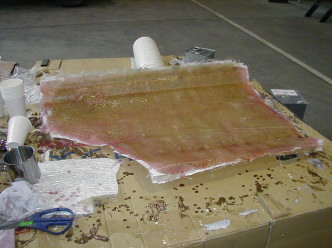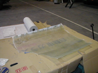 前に作った型で〜す! 剥離材塗布も終わり・・・ 缶から出した剥離材がもったいないので こんな型も作って見ました・・・ 2プライ連続積層後 1層目が固まって来たので〜・・・ パカっと剥離! ちなみに完全硬化後だと 良い剥離材を使ったとしても 結構苦労します 3回積層後型から剥がして お次は白い物体を・・・ ゲルコート中! 赤っぽいのは硬化剤・・・ ある程度固まると白くなります リアドアの皮が完成! 当然この後にサンディング等々必要ですが・・・ |