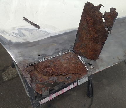 ![]() 右リアドア修復の続きです 腐ってる箇所を切り取っています 切り取った奥についでなので 転換液を塗って 乾くのを待ちながら 状態を確認します 3箇所ほど切り取り修復すれば大丈夫そうです ![]() 鉄板を切り出して来ました Rが付いてる箇所なので 平面のままって訳には行かなさそうです 下に転がしてある単管パイプや 膝とか(笑)に鉄板を押し当てて なるべくピタッとハマるよう合わせて行きます ![]() 中間部分の修復に入ります 工程的には前側と同じです ここも少しだけRしてるので グニッと曲げてハマるよう合わせます |