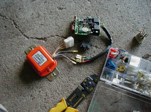 トランジスタなレギュレーターですな・・ しかし 他車種用・・・ 基本的なフルトラレギュレータの配線図(上) それを見ながら配線の当たりを付けて・・ コネクタもいらないヤツから拝借・・・ 取り付け完了! ちゃんと動作してます! |