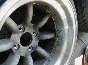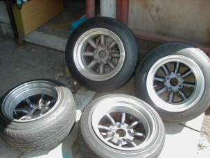 第138話 オークションで・・・その2 2003.7 またまたオークションにて ワタナベ15インチの9.5jj 10jjを買ってしまいました・・・ 今月もまた貧乏確定です・・・・ 品物が届き現物を見ると・・・・・・ 結構腐食が進んでいるようです・・ とりあえず このままでは少し格好悪いので 磨く事にしました・・・・・ ゴシゴシ・・・・・ ・・・・・・・ ・・・・・ 1日たってしまいましたが 結構綺麗になりました! とりあえず10jjは レストア中の4ドアに使用する予定 9.5jjは・・・・・・ 今度2ドアに履けるかチャレンジして見るか・・・・・ |