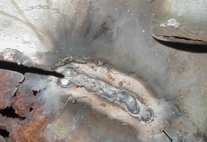 第140話 溶接機・・・ 2003.8 4ドアGTの板金を自分でやる為 半自動溶接機を買いました! 物はOT誌でも紹介された ノンガス100V フラックス入りワイヤー仕様 スズキッド製アーキュリー100 価格は5万5千円でした 早速どんな感じなのか試して見る事に・・・ とりあえず 腐ってかなり薄くなった リアパネルをつき合わせ溶接! ・・・・・・ ノンガスで100Vとあなどってはいけません 意外や意外 かなり薄い所ですがきちんと溶接出来ます 裏面もちゃんと裏ビードが出ていて 実力はかなりの物です ボデーの切り張りには かなり使えるでしょう! う〜ん 買って良かった! これで 4ドアの板金も進む事でしょう! ・・・・多分・・・・・ |