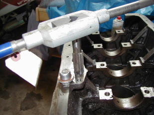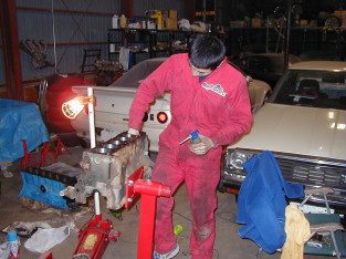 第191話 エンジンを・・・ 2004.4 今週も札幌の某地にエンジンを組みに行きました 先回はハコスカ用オイルストレーナー穴作成で そのお次は当然元のZ用ストレーナー穴を 塞ぐ作業をしました 下穴径が16ミリなので 塞ぐボルトは オイルパンのドレンボルトなどの M18ピッチ1.5の物を使います そんでもって加工に・・・・ まあ加工とは言っても タップを切るだけなので ものの10分で終了・・・・・ 有る程度切り粉をエアで飛ばして・・・・ ホイ完了! これで次の行程に移れます! ちなみに オイルレベルゲージの穴も移設したい所なんですが 失敗してオイル穴を貫通させた経験がある事と レベルゲージを切って短くしても ギリギリHI手前は 確認出来るので 今回は見送る事にしました で・・・さっさと次の行程に・・・・・ エンジンの洗浄とそれが終わるとメタル合わせ・・・・ 大体 0.04あたりでオイルクリアランスを揃えて・・・・ ん? そう言えば色を塗るなら今しか無いな・・・・・ そんな訳で思いつきがてら 青カンペで塗り塗り・・・・ と始終やっていると・・・・ もう夜です・・・・ 今回はこのあたりでおひらきに! さてさて 次回はどこまで進むのでしょうか? こうご期待!(笑) |
