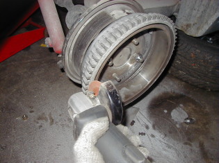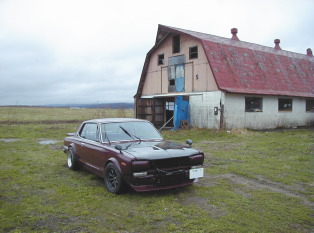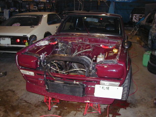 第197話 ハコスカ三昧・・・ 2004.5 今回は2部更正です まずは日中の部・・・・・(笑) かねてから入手済みで いつかGT−Rに付けようと思っていた アルフィンドラムを取り付ける事にします まずはさっさとノーマルのドラムを外して〜 アルフィンドラムを装着!! と付けては見たものの ハコスカにはドラムブレーキのバックプレートの耳が 当たってしまうので そのままでは取り付け出来ません・・・ 方法としては耳を全週切り取るか ドラムフィン部の中に耳が収まるよう 旋盤などでアルフィンドラムを加工するか の2種類になります と言う事で バックプレートは水の進入を 抑えている?と思うので 後者のフィンの加工を選択 もちろん旋盤加工なんか出すお金なんか無いので〜・・・・ GT−Rにドラムを逆に取り付け エンジンをかけて 車軸を回しながら サンダーで削って溝を作る事に・・・・ 題して GT−R型旋盤加工!(爆) ものの数十分削り完成です それではもう1枚 ・・・・・・・・・・ ・・・・・・・ ・・・・ これまた完成です! とりあえず取り付けて ブレーキ調整後走行して見ましたが 利き具合は全然変わりませんね (ドラムからドラムなので当然か・・・) ただしアルミフィン付きなので サーキット等で数周走ると効果が解るかもしれません 今度走る時のお楽しみですね! 2個完成です〜 取り付けました・・・ 利き具合は〜・・・・全然変わりませんが・・・・・ そんでもって第2部 夜の部は〜 2ドアGTに3リッターエンジン搭載です エンジンの仕様はE88ヘッド インテーク46ミリビックバルブ エキゾーストL28ノーマル ポートはガスケット合わせで拡大 カム加工74度 ブロックはN42 89パイ ESP製?ピストン クランクは程度選び選手権から勝ち残った ノーマル28クランク(笑) こんな感じのありきたりな3リッターとなっております ほんでもってまずはL20エンジンを降ろします まさ〜し氏とあっち行きこっち行きしながら降りました・・・ さて搭載・・・ その前に今回使用するクラッチ オグラ製OEMのツインプレートを取り付け・・・・ ではでは搭載・・・・・・・・・ ・・・・・・・・・・・・・・ ・・・・・・・・・ ・・・・ バタバタとしながら搭載完了・・・ とここで気づいたのですが 搭載中の画像を撮り忘れ・・・・・(笑) まあまあ後悔してもしょうがないので 補器類の取り付けに・・・・ 補器としては デスビはカメアリレース用風(笑)デスビ (中身は同じ) 点火はMSDの7A&プロパワーコイル キャブは手持ちのソレックス44で ジェットは 前の3リッター仕様のままなので パイロット55番 メイン 165番 エアー 200番 ポンプ 45番 って感じになってます 完成後 チョイ乗りしたんですが タコメーターの不調や 電磁ポンプの能力不足などなど 色々と発覚・・・・・・ まだまだやる事が山積みのようです・・・ こらからの課題ですね! さ〜て 面白い感じで動くハコが増えたし こらから また忙しくなる予感が・・・・・ 苦悩の日々はまだまだ続きます・・・・(爆) |