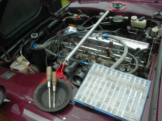 第212話 迷宮入り? 2004.7 今週も2ドアGTのセッティングです〜・・・・ まずは 点火時期が赤平行きロングドライブ仕様になっているので いいとこ探しをしながら進角させて行きます! デスビを回して〜・・・・ って一杯回しても上死点前30度ぐらいにしかなりません・・・ ・・・・・・・・・・・・・・・・・ ・・・・・・・・・ ・・・・・ ダメだこりゃ! やっぱり ギアのコマからやらないと・・・・・ と言う事でオイルポンプを外して ギアのコマを数コマ動かします! そんでもって今一度タイミングライトで確認! デスビを一杯進角方向に振って上死点前38度ぐらい・・・ 遅角方向に振って31度ぐらいになりました! とりあえず 35度あたりが 中間域でいい感じなのでここで固定! お次はセッティング作業に移ります とりあえず走って来ては換え また走っては換えの繰り返しです・・・ 最終的には パイロットが55 メインが180 エアーが270 ポンプが40と言う感じになりました ○ムカラ峠の登りもいい感じに吹け上がって行くので とりあえずはこの状態で様子を見る事に・・・・・ でもやっぱり納得はしてないんだよな〜・・・・ ほぼ迷宮入り状態です・・・ 今回天候が快晴だったので次は若干曇りの時に もう1度トライですね!(笑) |