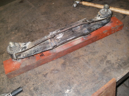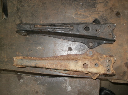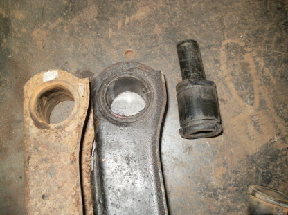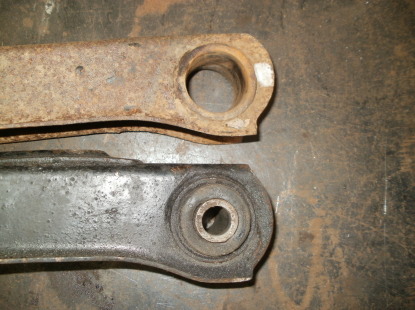 第135話 比べて見よう! 2018.2 まずは外観と取り付け寸法から見てみます スタビ穴 ボルト穴の位置関係と寸法は同じようです 中央にプレスされた板状の補強が溶接されてます これが強化されてるって事でしょう(笑) 流用を考えるより ハコスカ用に同じ補強をした方が 早いかも(笑) もしや?と思ってカラー付きブッシュのゴム部分だけ 無理矢理抜いて見ました カラーの厚みは1mmで 内径は33ミリ これでハコスカの穴の始まりサイズと同じになりました 今のところ何か対策を考えないと使う気にはなりません どうせもらったモンだし思い切ってカラー中央を 溶接して肉盛りしちゃうか 1ミリぐらいの板をくるっと巻いてカラーを作るとか 色々思考は巡りますが また気が向いた時にでも作業再開したいと思います(笑) |