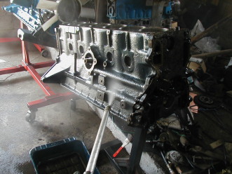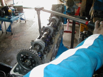 第280話 とりあえず完成!! 2005.5 さて!ちまちまと続けて来た L3.1組み立てですが とうとう最後の大詰め作業 バルタイの測定&決定に 漕ぎ着けました! まずは268話で作ったカムプロフィール図を元に このカムの中心角に設定します まずはロッカーアームを付けずカムスプロケを外します (スプロケは調整式なので 微調整ボルトを外しただけです) あのカムプロフィール図だと1番排気側カム山作動開始から159度 (クランク角度318度)で1番の上死点=カム中心 となりますので クランクをTDCから318度逆戻し・・・・いや・・・・ チェーンの逆転でバックラッシュがありますので 余分に逆転させて TDC −318度に正転させます そして今度は 1番排気側にロッカーアームを付け タペットクリアランスを0に取り その状態で1番排気のリテーナーにダイヤルゲージを当てて 1番排気のカム作動開始を探ります 探り当てたらその状態でカムスプロケを固定し 0だったタペットクリアランスを0.25に撮り直し・・・その後 もしものバルブ接触に細心の注意を払いながらクランクを回し 残りのロッカーアームを全部付けます 当然タペットクリアランスも取りながら・・・・ 12カ所ロッカーアームが付いたら 今一度 細心の注意を払ってクランク2回転・・・・ どうやら バルブの接触は無いようです! 確認の意味を含め クランクをTDCに合わせ 6番がちゃんとオーバーラップ状態か調べます 6番給排気リテーナーにノギスの端を当てて カム山と平行になるか確認・・・・どうやらOKのようです! それでは クランクをもう1回転させて1番に同じ事を・・・・ こちらもOK! これでカム中心角による バルタイが決まりました! が・・・・・・なにぶん正体不明加工カムなので 後は動かして調子を見ながら 5度前後振ったり戻したりしようかと・・・ それではバルタイも決まった事だし次の作業に移ります! オイルパンやらヘッドカバーやらフィルターやらなんやら付けて〜・・・ ・・・・・・・・・・・・・・・・ ・・・・・・・・・・・ ・・・・・ これで搭載出来る状態になりました! が・・・その前に激安エンジンオイルを入れて〜・・・・ 初期3分割ミッション釜とセルモーターを付けて ホイッ!クランキングマッスィ〜ンの完成! プラグを外して オイルキャップは付けず セルにジャンプケーブルでバッテリーから直で電気を・・・ オイル注入口からカムにオイルが上がって来るのを確認しながら 気の済むまでクランキングします! ・・・・・・・・・・・・・・・ ・・・・・・・・・・ ・・・・・・ セルが熱くなるので休み休みやること30分・・・・・ もうオイルも各部に回り オイルパンにリターンしてるはずなので オイルを抜いて そのオイルをポイッ! これで正真正銘!エンジン完成で〜す! マニガスケット手配の関係上搭載は来週以降にに持ち越し予定・・・ なにはともあれGW中に完成出来ました 搭載した姿を夢見る日が まだまだ続きそうですが・・・・・ |