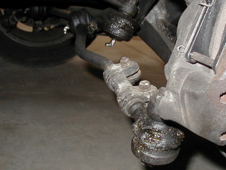 さて・・今回のお品書きは・・・ 右側ロッドエンドブーツ交換・・・ ぎょえーっ! 2年前までは一応無事だったのに・・・・・ 右側3カ所交換完了で〜す! |