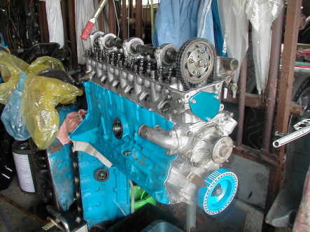 第407話 やっと完成・・だけど・・・・・ 2007.5 全然作業が進んでいませんでしたが 3リッターエンジン作成の続きです! 先回腰下が完成したので ヘッドの合体作業に移ります・・・・・ そんでもって 今回使用するのはこのN42ヘッド! 313話で登場し347話で壊して 修理後今回また復活!! 結構古参の愛着あるブツです 仕様的には変わらないので 細かい内容を313話 修理内容は347話を見て下さい カムの方は色々と考えましたが 76度加工カムで行きます! それではt=1.2ミリのメタルガスケットを敷いて ヘッドの方は6番を大体オーバーラップ状態にしたら よっこらしょ!っとヘッドを載せます! ヘッドが載ったら ヘッドボルトを4〜6〜8キロと トルクレンチで段階的に締めていって 最終確認でトルクを見たらヘッド合体完了! スライドスプロケはたまたま近くに転がっていた ニスモ製を使用しタイミングチェーンをかけたら バルタイの初期測定に移ります! 計測の結果EXがTDC−112.5 INがTDC+105.5だったので このカムの位相角は218度 2で割ってIN EX TDC±109度で このカムの中心角に取ります 後は始動後に振ったり戻したりして様子見ですね バルタイが決定したら お決まりの 6番で同じ計測をして確認作業・・・・ 大体同じ数値で異常が無いようなので 2〜5番のロッカーアームをクランクを グルグル回しつつ取り付け・・・・・ 最後の大きい作業でタペットクリアランスを 0.15きつめゆるめで取って ロッカーのスプリングを付けたらヘッド回りは完了! 後はエンジンをひっくり返してオイルパンを取り付け・・・ オイルパンは396話で作ったバッフル付きを使用します! よ〜し!これで完成だ〜っ・・・・・ おっと忘れてました・・・・ 今回使用するOSシングルクラッチも取り付けて〜・・・・・ ホイ!3リッターエンジン完成! そんな訳で急遽勃発したエンジン作成だったのですが 完成したその翌日 このエンジンの使用目的だった 2時間耐久レース参戦が仕事の都合で無理と判明・・・・ 目標を失って脱力感に覆われながらも 完成したのにこのまま放置・・・ってのもなんなので 近いうち搭載して火入れをする事に決定しました! 搭載がいつになるかは不明ですが 一応エンジンは完成・・・・って事で・・・・・・・ |