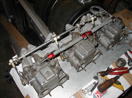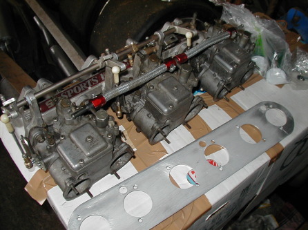 第410話 もっとOERと遊ぼう! 2007.6 今週末は色々と忙しく 時間をかけて没頭するような作業が出来ないので 前々からやろうやろうと思ってほったらかしだった事を やる事にしました! 車庫内を見回すと 多種多様のほったらかし作業が転がっていて なにからどうしてさっぱり手つかずなので 先週のOER50取り付け成功?のゲンを担いで 今回はOER45を触って行く事にします まずはキャブをゴソゴソと棚から降ろして 台の上に置いてみます・・・・・ う〜ん・・・・SKのマニか〜・・・・・・・ と言うのも このSKマニ 見てくれはかっこいいのですが いかんせん スロットルシャフトの取り付け位置が高く スロットルレバーがボンネット裏にぶつかってしまいます それを回避する為にはスロットルシャフトを短い物にするか SKマニ専用?のくの字レバーを使わなければいけません・・・・ しかし 手持ちのレバーは皆ストレートタイプなので このレバーで使う為には短いシャフトで行かないと・・・・ そ〜すると今度はキャブのスロットル開度が全開になりません・・・ おまけに 私の2ドアGTはアクセルがリンケージ式で シャフト端を回す形になります しかし前にも書いたようにシャフト自体の取り付け位置が高いので シャフトを回す為の鍵手位置が 丁度キャブのチョーク位置の出っ張りにごっちんこ! それを回避する為マニのスロットルタワー中間に アクセルリンケージ取り付けシャフトがもう一本あるのですが このシャフトの鍵手を付ける位置があまり一般的で無く 長いアクセルリンケージを作らなければならなくなってしまいます 100歩譲って アクセルリンケージを作ったとしても 余計なシャフトを一本介しているのと アクセルシャフト→スロットルシャフトが 中途半端なレバー比変換な為 ただでさえ重いGT−Xのリンケージ式アクセルが さらに重くなるうえ たまーにアクセルが戻らず 引っかかったりもします・・・ う〜ん・・・・・ やっぱり弊害多しです・・・・・・・ そんな訳でまずはインマニの交換です! 交換するマニはどれにしようかな〜・・・・・ ・・・・・・・・・・・・・・・・・・・・・・ コイツはどうだ・・・・・・・ ・・・・・・・・・コイツもSKだ・・・・・ ・・・・・・・・・・・・・・・・・・・ あっちにもあったよな〜・・・・・・・・ ・・・・・・・・・・・・・・ じゃあコレ!あり?三ーSの刻印・・・ってコレもSKぢゃん・・・・・ ・・・・・・・・・・・ ここら辺にもあった気が・・・・・・ 立てかけてあったオイルクーラーをヒョイとどけると・・・ じゃじゃ〜ん!HKSのマニ発見! インマニはこのHKS製に決定! 上手い具合にソレックス44用だったので キャブ側ポートをリューターで少しさらって45に拡大! 後は諸々のパーツを取り付けて〜・・・・・ ホイ!L6用OER45キャブAssy完成! そんな事をしてるうちに時間も過ぎてタイムアウト・・・・ 本日の作業終了です・・・・・ とりあえず このOER45も 取り付け可能な所まで来ましたが 先回取り付けたOER50も まだまだセッティングの余地を残しまくりなので 今すぐ交換!と言う訳には行きませんが いつになるか解らないものの こちらもそのうちテストして見ようと思っています |