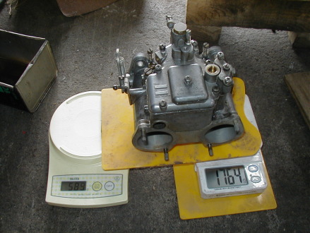 第470話 OERのポンプ調整! 2008.5 今週もOERネタです さてさてジェットセッティングの続きを〜・・・・・ と行きたい所なんですが メインをまだ買えずに居るので セッティングはおあずけ・・・ それとは違う作業で今回は ポンプアジャストスクリューの調整?をやる事にしました! と言うのも先般 (株)OER様に直接技術質問を ぶつけて見た所 直接お電話にて返答があり そのついでに このスクリューの調整を聞いて見たのでした その回答は・・・・・・ このスクリューは OER45新品の初期出荷状態(ポンプ40)で 1回の作動につき0.4cc吐出されるようにセットしてあるそうで その状態を基準に 6気筒車なら 3基共同じ回転数 締めるか緩めるかで増減を行いながら セッティングをして行くそうです そして その初期スクリュー位置は 1番奥まで締め込んで何回転や その逆で緩めてから何回転と言う数値は無く あくまで吐出1回0.4ccになるスクリュー位置が 基準となりますので初期位置が解らなくなった場合や 中古で入手して 既にバラバラにいじられた物などは あまりキャブに詳しくない方だと 初期状態に戻すのがお手上げな感もありますし ちまたのキャブOH屋さんに出したとしても SOLEXやWEBERには無い機構なので (※実はSOLEXやWEBERも 非分解になってる部分で調整出来ますが・・・) よほどキャブに精通したお店で無いと ここまでやってある(くれる)かどうか 微妙な感も有ります・・・ なのでここら辺がOERキャブには当たりはずれ?が多く OHしてもセッティングが出ない??同調が取りづらい??? と言われている所以なのかと思います 担当者様からの余談ですが やはり中古のOERや新品のクレーム? などでこのスクリューを既にバラバラにいじってあったり カンでグルグル適当に回してしまい 調子を崩しました・・・(同期が取れずセッティングが全く出ない) と言う質問が結構多いそうです ちなみにその基準値が狂った場合の調整要領としては 1回の吐出0.4ccを計る・・・・事は難しいので レバーを5回動かして吐出させ それをメスシリンダーでこぼさず採取し 5回の合計が2ccになるよう調整して行くそうです・・・・ しかしこの調整方法を個人でやる場合だと 微量を計れるメスシリンダーなんかが必要になりますし ほんの少しこぼしたり集められなかっただけで 数値が変わって来ますので もっと簡単?に調整出来る方法を 勝手に考えてやって見る事にします!!! 前述した通り 1回のポンプ作動による吐出量基準値は 0.4ccなのでガソリンの比重0.75をかけると 0.4×0.75=0.3グラムなので レバーを押して10回吐出させ 吐出前より重さが−3グラム減る所に調整して行けばOKとなります それではこの方法で実践して見ましょう! ではこの前付けたばっかりのキャブを1つ外します 外したらまずはポンプを作動させ目視で 左右均等に吐出しているか確認! レバーを動かしてピュピュッと出した結果 どうやら左右に差は無い感じです お次は秤に乗せて重さを量ります・・・・ って 激安デジタル秤なので 2キロまでしか計れず 2キロ以上重さのあるOERは1台じゃ計れません・・・・ 確かもう一台計りがあったのでソイツを持ってきて 2台で計れば〜・・・・・なんとか計れました! 秤2台の重さを足して 更に数値の追い込みと言う事でアルミの○○玉(1グラム)を 半分に切った物(0.5グラム)と その半分をまた半分に切った物(0.25グラム)の 計測ウエイトを用意して そのウエイトの一番軽い方から秤の端に 1グラムの数字が変わるまで乗せて行き 変わった所から今乗ってる計測ウエイトの重さを引いて 0.25グラム単位まで追い込んで行きます 重量を量ったらレバーを押して10回吐出! スロットル回りについているガソリンもキッチリ拭いて 再び重さを計測! その結果当初の重さは2330グラム 吐出後の重さは2328.25グラム 差し引いて−1.75グラム 吐出の誤差を確認する為 何もイジらずに また10回吐出後計測・・・・ 今度は2326.5グラムなので ポンプの作動は意外と正確なようです しかし10回で−1.75グラムだと吐出が少ないので −3グラムになるまで何十回も結局何百回も(笑) ポンプアジャストスクリューを回しちゃ吐出させ計測・・・・ を繰り返しました・・・・・・・ 多分100ウン十回・・・・・ぐらい計測した所で 10回吐出で大体−3グラムになりました! これで1基終了・・・・(泣) 終わったら早速取り付けて次のキャブに着手・・・・(大泣) キャブのレバーをカチャカチャイジっては 重さを量って・・・・・・・を丸1日繰り返して ようやく3基終了・・・・・ 喜び勇んでエンジンをかけて見るものの 目に見えた変化は全くありません・・・・・ まあまあ実走をした訳じゃ無いのでなんともなんですが 一応キャブ3基共ポンプの吐出が 基準値に戻ったと言う事でヨシとします 後はここから3基均等同方向回転でスクリューを回して 増やしたり減らしたりして様子を見ようと思います ジェットを入手して ソコソコちゃんと走れるようになってからですが・・・(笑) |