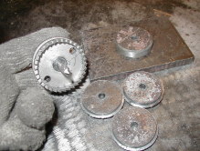久々の作成モノです! 10ミリ板を切り出して〜40ミリのホールソーで穴開け・・・ さて何でしょうか? こういう形の物を4枚作成・・・・・ そして別の板で1サイズ大きめの45ミリホールソーで また穴開け・・・こちらは抜いた中側を使います 作った物を溶接で張り合わせるとこうなります! ホイ 20ミリロールセンターの完成! このままじゃなんなのでシャーシブラックで色を塗ったら 早速4ドアに取り付け・・・・・ ちなみに元々の取り付けボルトは付かなくなるので 50ミリ半ねじ8番のボルトに変更 ついでにバンプラバーも取り外し・・・・ 取り付け後のアームのクリアランスですが 接地状態でコレだけあれば大丈夫でしょう! |