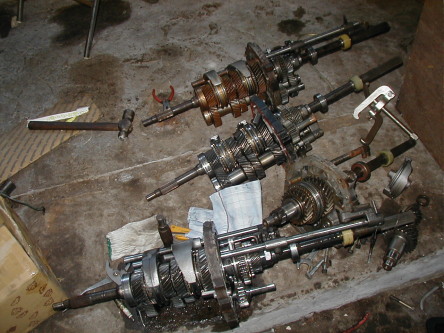 第481話 2個一?3個一?いや4個一(笑) 2008.8 先週のデフに続き?今週も駆動系のネタで行きます! そんな訳で今週のレシピは〜・・・・・ 71CタイプMミッションの分解&観察です! それでは 各種ブチ壊れ71Cミッション軍団の登場です! まず 71Cミッションの故障の系統としては シャフト系のトラブルが非常に目立ちます メインシャフトで行くと プロペラシャフト差し込み部の ねじれや折損等々 カウンターシャフトだと 5〜R部スプラインの ねじれや折損などが多いです しかしギアやシンクロのトラブルは比較的少なく 殆ど無傷な場合が多くシャフトだけが ポキッとと逝っている物ばかりです ただし S13〜S15系シルビアや R32スカイラインなどは シンクロやギア自体が逝ってる事が多く Lなんかだとかたやハイチューンでも300馬力超 SRターボやRBターボなんかだと かたや500馬力オーバーで馬力で見ると???なんですが その辺はNAとターボの出力特性なのかな?と感じます その逆?で今度は71Bミッションだと シャフトの捻れや折損のトラブルは非常に希で (目視出来る所に現れないだけで 捻れてるかもしれせんが・・・) 軽度の物だとギア抜けやギア鳴り チェンファーやボークリングの異常摩耗 シンクロキーやインサートの脱落 最終的にはギア自体の歯飛びや シンクロナイザーAssyの破壊など シンクロやギア特にメインシャフトに取り付けられている側 が逝く事が多いです まあまあこちらの方が カウンターシャフトだけ なんとか生きて居ればシンクロやメイン側ギアを 交換すればなんとか修復可能なので 存命の道があっていいのですが・・・・・・ まあまあ 故障の傾向はこれぐらいにして だだっとおっぴろげた71Cミッションを分解・・・ あれやこれやと全バラししてもしょうがないので カウンターシャフト折れだけでで メインシャフト側が生きている物をベースに 今度はメインシャフトのプロペラシャフトのスプラインが 逝ってる物からカウンターシャフトとくっついてる諸々を拝借・・・ 後は 程度の良さげなメインドライブシャフトと サブギア回りを拝借して組み合わせれば・・・・ 4基を使ってなんとか1つだけ蘇らせる?事が出来ました! ホイ!タイプMミッションが4個1で1基完成!(笑) 残りの3基は完全にゴミとなりましたが・・・・・ なにはともあれミッション内部は完成したので そのうち 釜と組み合わせて ちゃんと完成させたいと思います・・・・・・ |