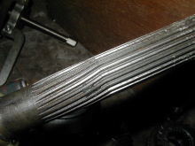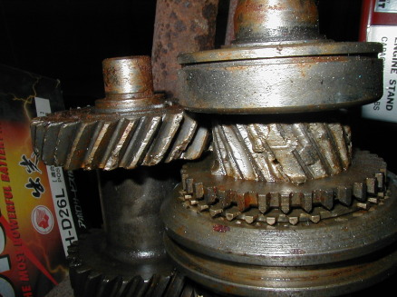 ダメダメCミッション色々です 71Cミッションでよくある?トラブルと言えば〜 カウンターシャフトの5〜R部スプライン捻れ 折損や (画像左) プロペラシャフトのスプラインが捻りん棒&ポキリとか・・・ (画像右) しかしギアやシンクロの損傷は少なく シャフト自体がボッキリ折れるって事が多いです ちなみにこちらは71Bミッション画像 トラブルは71Cの逆でシャフト系のトラブルは少なく ご覧のようにギアが飛んだり シンクロが逝ったりする事が多いです・・・ (特にメインシャフト系のギア&シンクロ) まあこちらの方がギアとシンクロを組み替えれば治るので 修理する道があっていいんですが・・・・ とりあえず4基のゴミ?を組み合わせて 色んなトラブルを経験したタイプMミッションが1つ完成(笑)・・・・ |