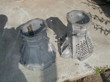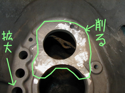 外してあった71B釜があったので 71C用釜に加工します その前にバラしたミッションののアダプタープレートをぶった切って こんな治具を搾取(右) 今時はここに入る1〜2ロッド先端を細く加工する方法が多いんですが 加工に持っていかないと出来ないのでオイラはコチラ・・・ 治具で位置決めして14ミリ穴→16ミリへ穴拡大! 後はカウンターサブギアが当たるのでケース内部の方から カウンターギアフロントベアリング(小さい穴の方)の 回りの出ているリブを削って行きます 穴拡大と合わせこれで完了!(ケース内部画像) 後は組み付け時 カウンターギアフロントベアリングを 71B用に交換して組み付けです |