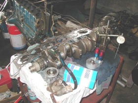第84話 作業開始! 2002.7 今週はイベントも無く・・・・ (って 実は名寄で行われているのですが・・・) とうとう待望の3リッターエンジンの組み立てに入ります! まずは メインのF54ブロック君! とっかかりの縁起を担いで 色を塗ります! で次はL28クランク! 眺めていても進まないので さっさと組んじゃいます・・・・ メタル類は 中古を使用するので まずは一カ所一カ所プラスチゲージで測定して行きます 計り終わったトコで クリアランスの修正 ガラス板・・・はこの前踏んづけて割ってしまったので 平たい物はと・・・・・ おっ! 転がっているブロックの上を使う事にします その上に1500番の紙ヤスリをしいて メタルのクラッシュハイトをゴシゴシ・・・ でまた計測・・・・ これを繰り返して繰り返してと・・・・ ホイ完成! (今回はオイルクリアランス0.025〜0.03ミリで揃えました) んで さっさと クランク組み付け! それが終わるとピストンへGO! ここでも上の作業の繰り返し・・・・・ これも終わって 組み付け・・・ で 2個ピストン入れたトコで終了! 来週末は はぎの(白老)でイベントなので 次のとっかかりはいつになる事やら・・・ まあ 完成しても 乗せる車がまだ無いので 焦る必要は全くないのですが・・・・・ |