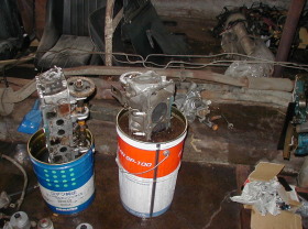 ピストン全部入りました〜! トルクをかけて 腰下完成! ほんでヘッド入浴中! (液体は バンザイ ニューパワーソープ) 右がN42 ポート加工済み!これを使います 左L20用 E30ヘッド・・・ でで〜ん! 買っちゃいました 71Cミッション しかもL用加工済み! ラッキーでした |