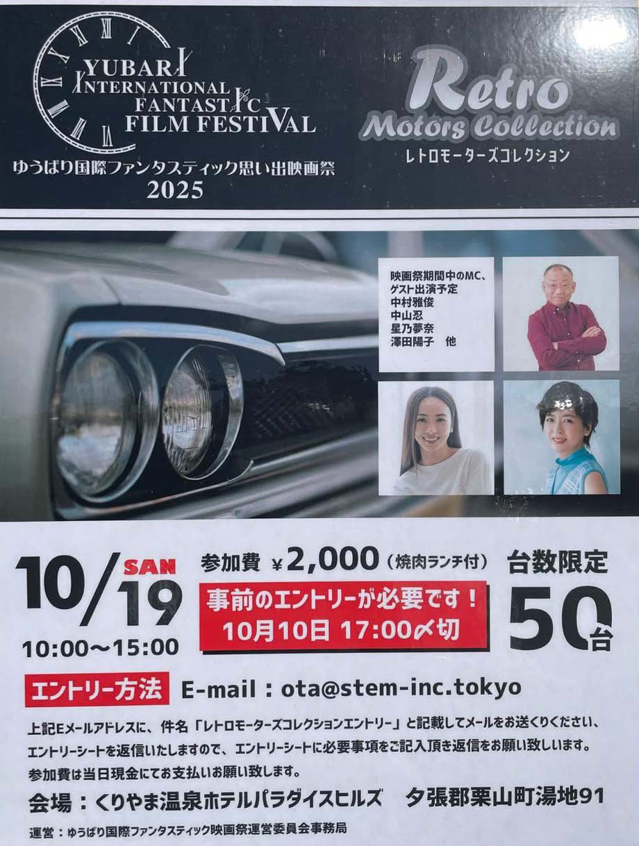 ゆうばり国際ファンタスティック思い出映画祭2025 レトロモーターコレクション 日時 2025年10月19(日)10:00~15:00 雨天決行 場所 夕張郡栗山町湯地91 くりやま温泉ホテルパラダイスヒルズ特設会場 参加資格 生産から20年以上位経過した車(車輪の数有無問わず)で車検付きの車 参加費 1台2000円(1名分の昼食付き)同乗者の方も希望される場合は1人2000円で昼食付き可。 ※事前申し込み時お伝えください 当日現金にてお支払いお願いします 当日、同会場にて他にもイベント開催中の為ホテルレストランは大変混み合うと思われますので 事前昼食の申し込みをおすすめします。 申し込み方法 10月10日までに専用メールota@stem-inc.tokyoへ 件名「レトロモーターコレクションエントリー」と明記してお送りください。 折り返しエントリーシートを送りますのでエントリーシートに必要事項をご記入頂き返信をお願いします。 限定50台 約束事: ①締め切り後の申し込みまたはキャンセルはできません、当日キャンセルも不可 ②参加資格のある車での見学来場は不可(敷地に限りがあるのでご協力ください) ③行き帰り道中会場内外での安全運転厳守 ④協調性のない方の参加はできません ⑤主催側の趣旨を理解できない方は参加できません ※事前申し込み及びキャンセル締め切り日時:2025年10月10日17:00まで ※その他、不明点や質問はお問い合わせください。 ※会場への直接問い合わせはご遠慮ください その他わからない事がございましたらお問い合わせ下さい 問い合わせ Tradition70’sスワップミート事務局 TEL 080-3093-6226 ミズグチまで ![]() |